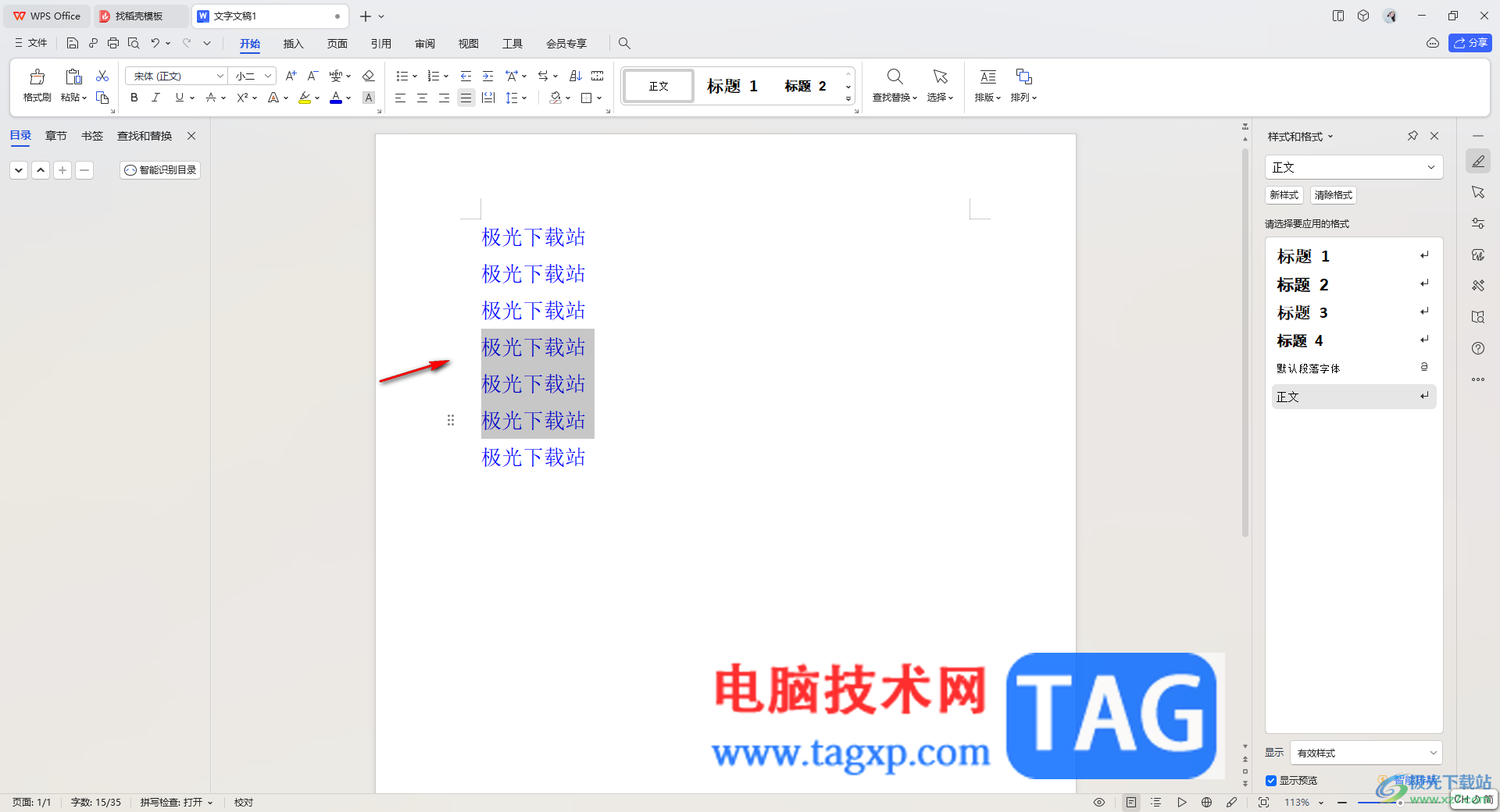 4.此外,我们也可以通过另一种比较经典的方法,就是选中统一的文字字体样式,可以查看一下该文字字体样式的参数,比如设置了宋体、小二以及蓝色字体。