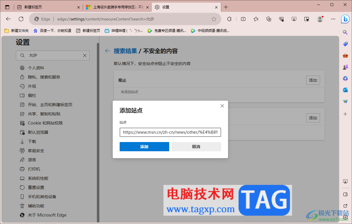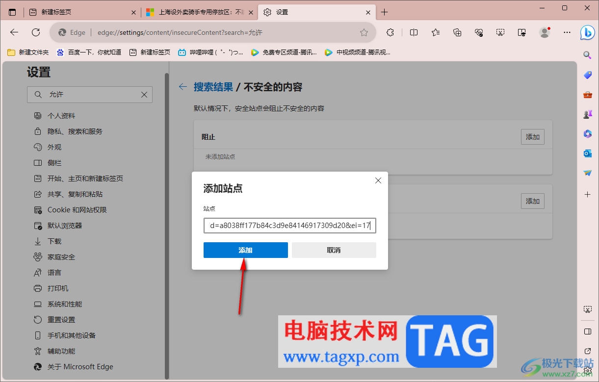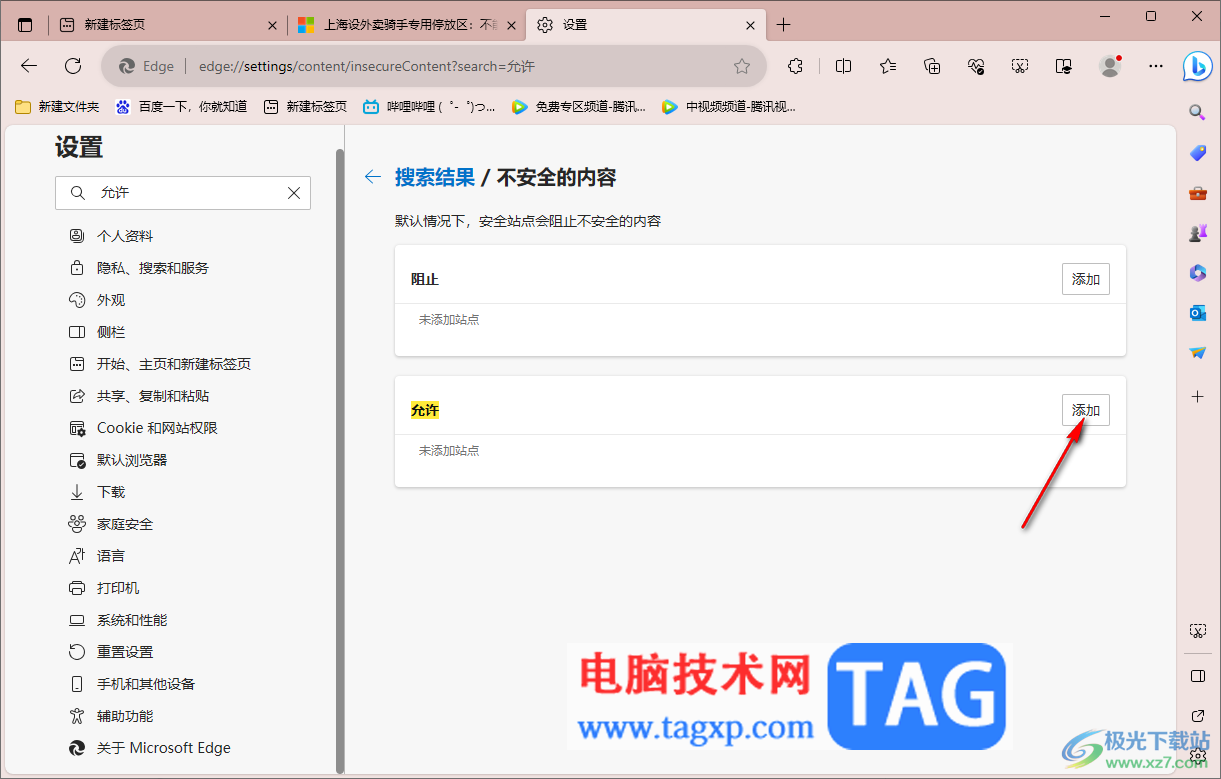 4.之后进入到不安全内容的窗口中,在该窗口中将【允许】后面的【添加】按钮进行点击一下。