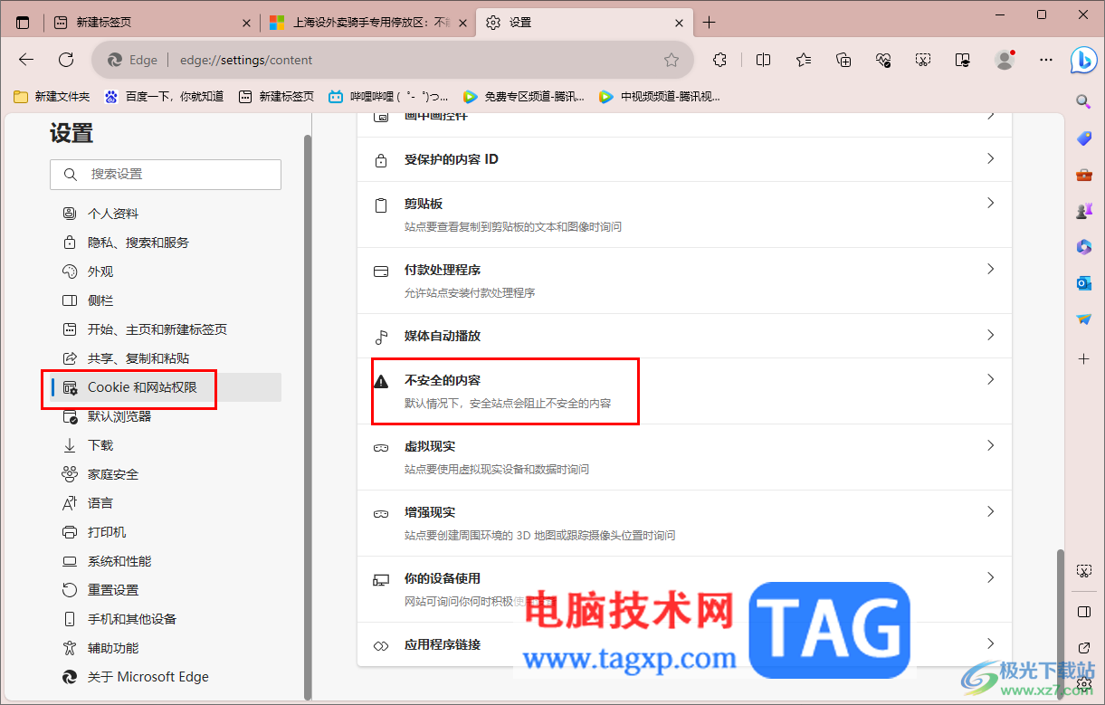 3.之后,在打开的窗口中,这时我们需要在左侧的【cookie和网站权限】选项,然后在右侧滑动页面找到【不安全内容】。