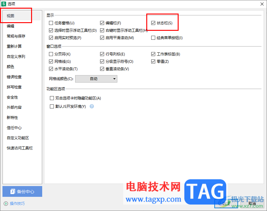 4.当我们来到了选项设置的窗口中之后,只需要在【视图】选项的页面中,找到右侧的【状态栏】即可,当前的状态栏功能是开启的。