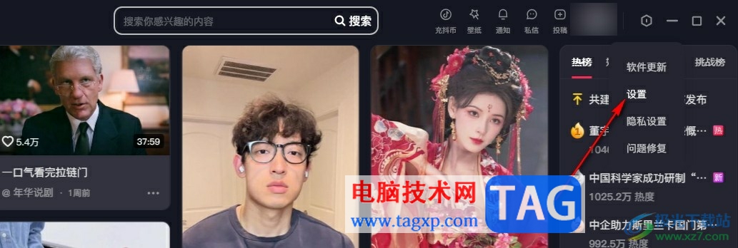 2、第二步,进入抖音页面之后,我们在页面右上角的工具栏中找到设置按钮
