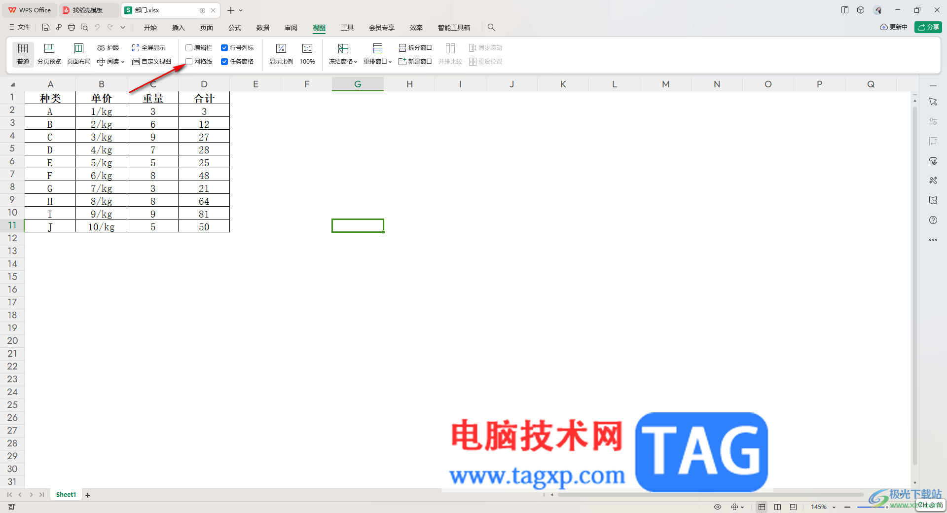 5.此外,在该工具栏中还可以进行行号列标、网格线以及任务窗格的启用,比如当你将网格线取消勾选之后,那么页面上的表格框线就没有了。