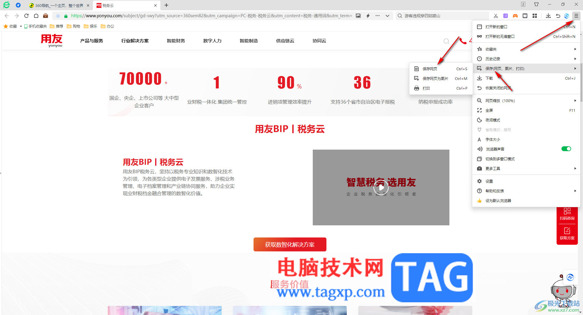5.此外,如果还可以直接在网页右上角的位置点击【三】图标,然后在打开的选项中选择【保存】选项,在子选项中选择保存网页也是可以的。