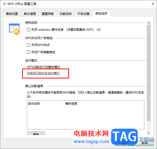 5.在其他选项的窗口页面下,就会看到【运行模式】下有【切换到旧版的多组件模式】选项,直接用鼠标左键点击该选项。
