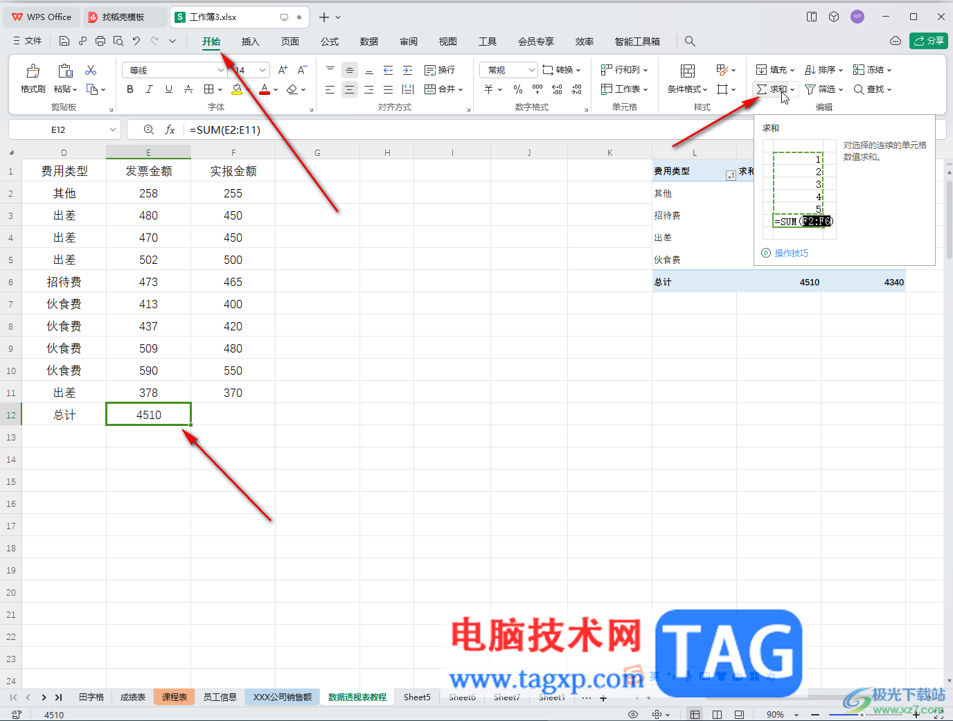 第二步:定位到数据下方紧挨着的空白单元格,在“开始”选项卡中点击“求和”按钮可以快速对连续数据进行求和;