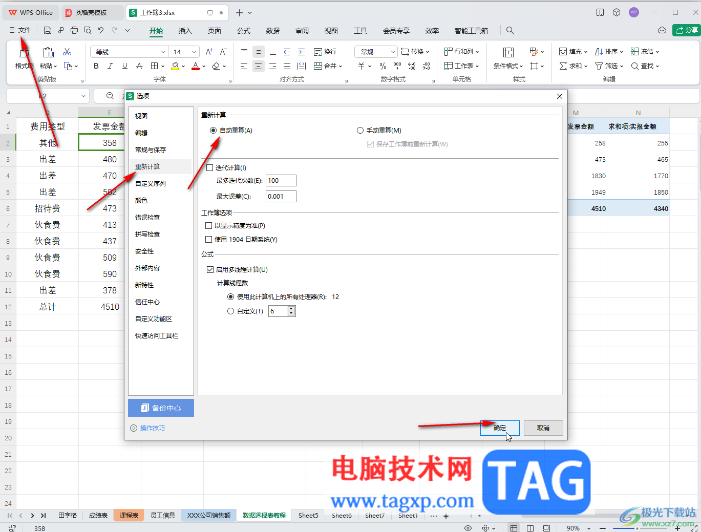 第四步:点击“文件”——“选项”,在打开的窗口中点击切换到“重新计算”栏,然后在右侧选择“自动重算”并确定;