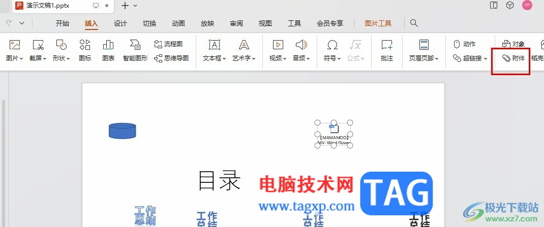 3、第三步,在插入的子工具栏中,我们找到附件工具,点击打开该工具