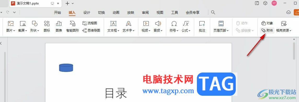 很多小伙伴之所以会选择使用wps来对演示文稿进行编辑,就是以为WPS中的功能十分的丰富,我们不仅可以使用WPS中的工具对幻灯片进行排序、编号等设置,还可以在幻灯片中添加艺术字或是各种动画效果。有的小伙伴在使用WPS对演示文稿进行编辑的过程中想要在幻灯片中添加附件,这时我们只需要打开插入工具,然后在其子工具栏中就能看到附件工具,打开该工具之后在文件夹页面中选择好文件并点击打开选项即可。有的小伙伴可能不清楚具体的操作方法,接下来小编就来和大家分享一下WPS PPT设置附件插入的方法。
