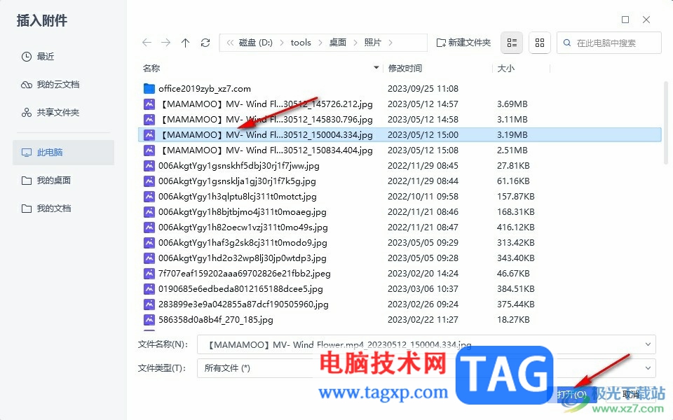 4、第四步,进入插入附件页面之后,我们在该页面中选中准备好的文件,然后点击打开选项