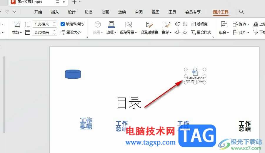 5、第五步,点击打开选项之后,我们在幻灯片中将插入的附件放到合适的位置即可