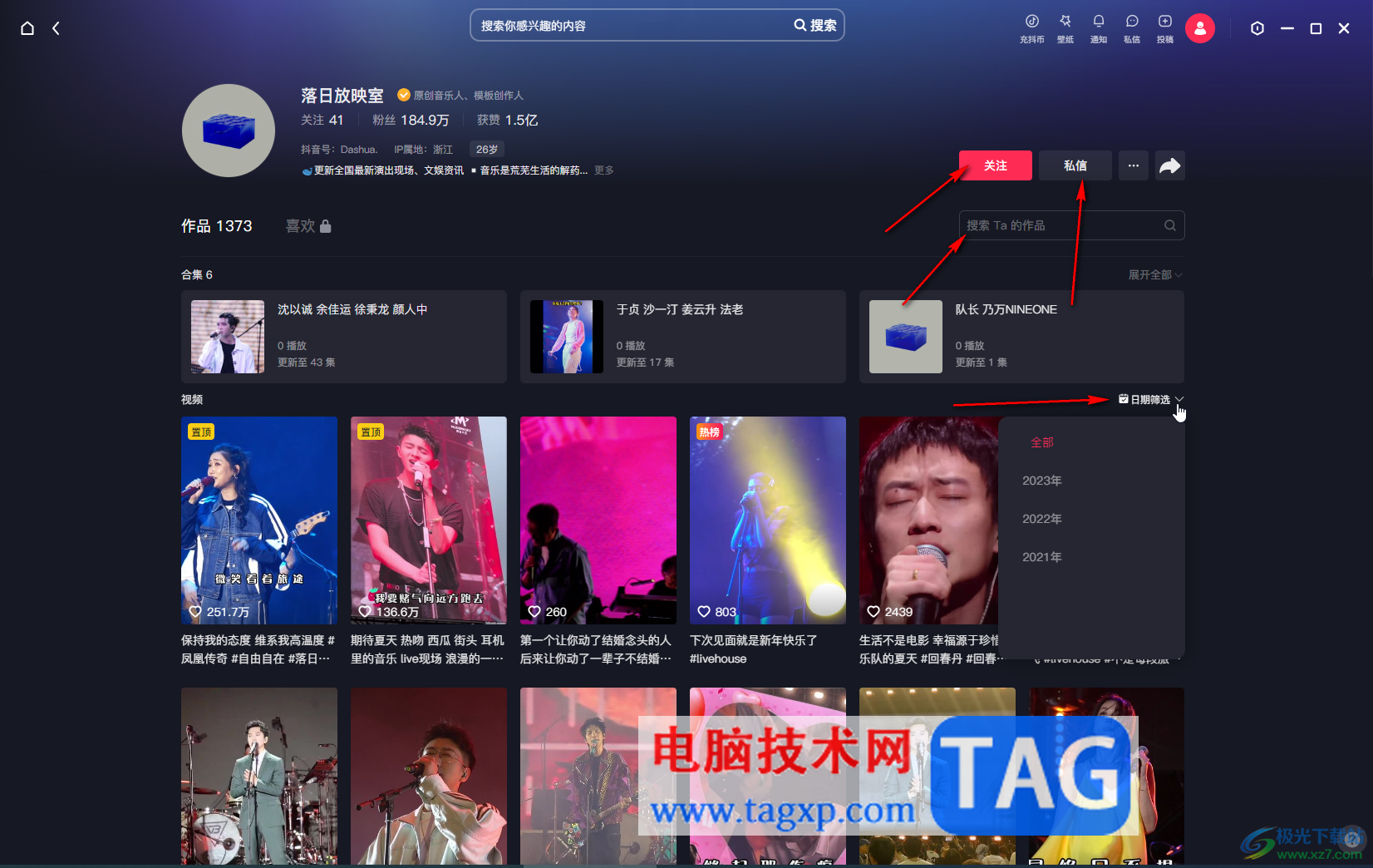 第四步:如果有需要也可以点击关注作者,私信作者,搜索作者的作品,按照日期筛选作者的作品等等;