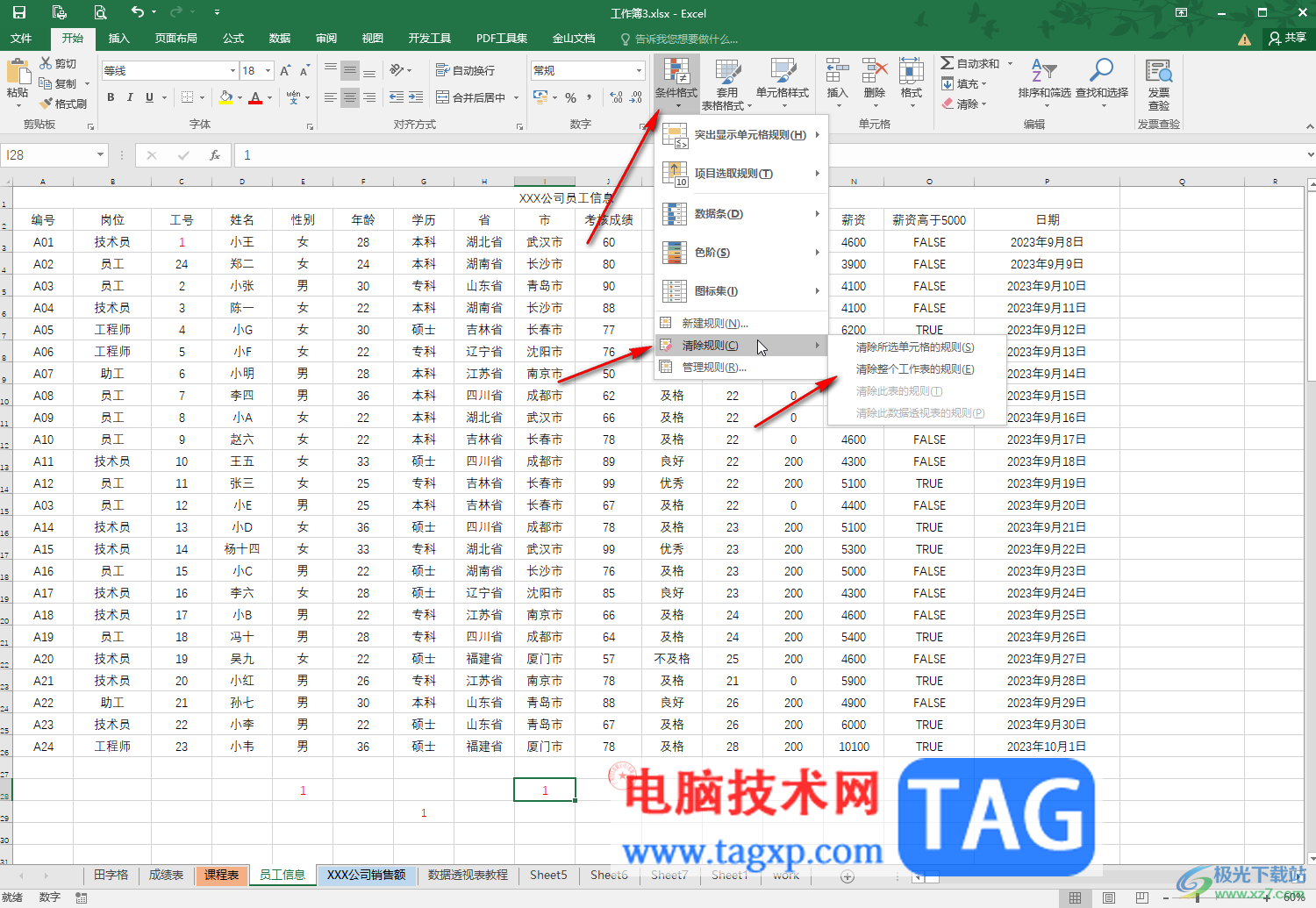 第五步:如果后续不再需要这样的效果,可以点击“条件格式”后点击“清除规则”,根据需要选择清除某个单元格的规则或者清除整个表格的规则。