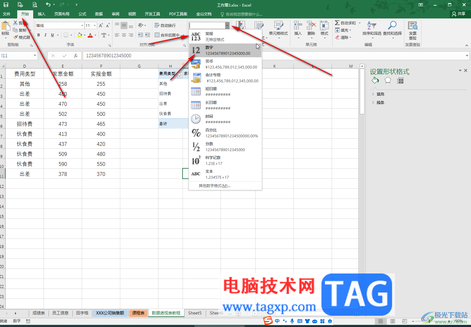 第二步:选中数据后,在上方点击“开始”选项卡中点击如图所示位置的下拉箭头后,选择“常规”或者“数字”格式;