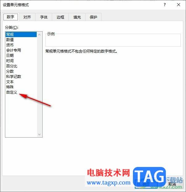 3、第三步,在弹框中,我们在数字页面中点击打开左侧列表中的“自定义”选项