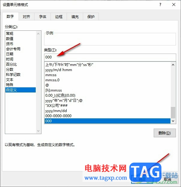 4、第四步,在自定义页面中,我们在类型框内输入“000”格式,然后点击确定选项