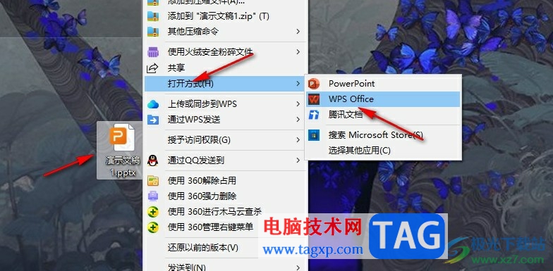1、第一步,我们在电脑中右键单击一个演示文稿,然后在菜单列表中先点击打开方式选项,再选择WPS选项