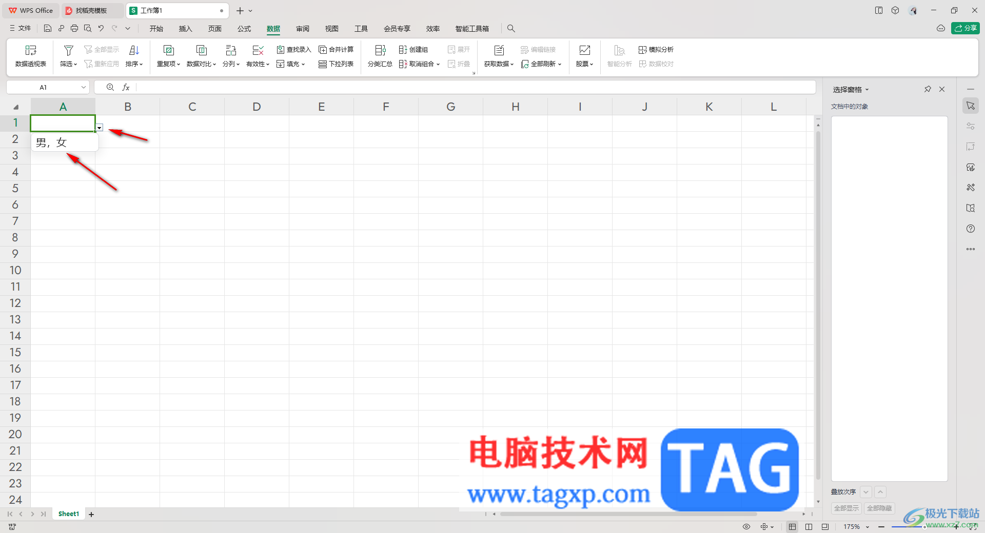 1.在WPS中,将Excel表格工具页面打开,可以看到当前的限制条件为【男】【女】,说明该单元格只能输入该内容选项。