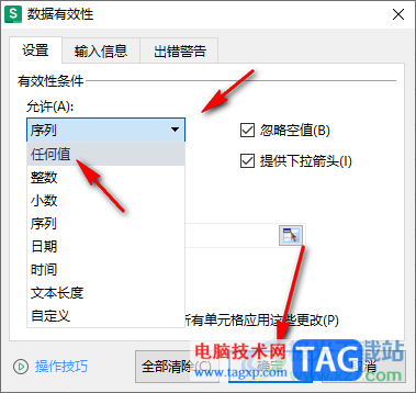 4.随后,即可在页面上弹出一个数据有效性选项窗口,在该窗口中将【允许】的下拉按钮点击打开,选择【任何值】,之后点击确定按钮保存设置。