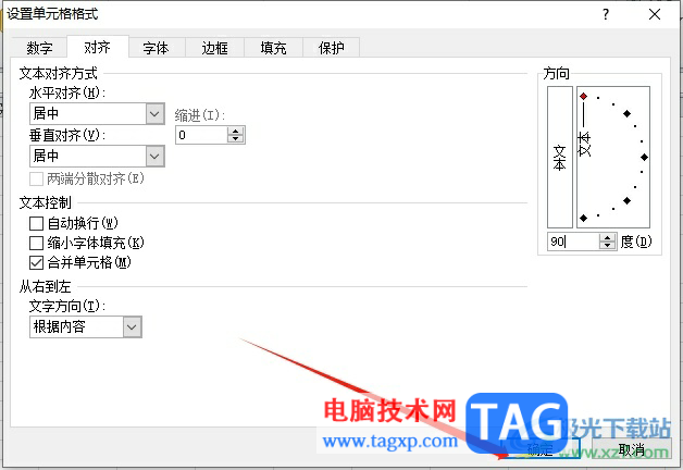 4.然后继续在选项卡中选择其中的对齐选项卡,接着将文字方向设置为90度