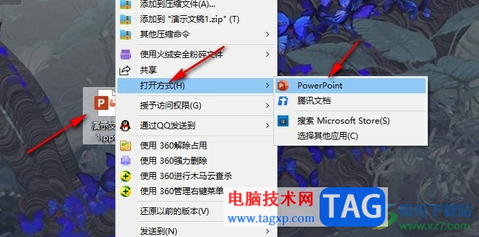1、第一步,我们先右键单击一个演示文稿,然后在菜单列表中点击“打开方式”选项,再在子菜单列表中选择“powerpoint”选项