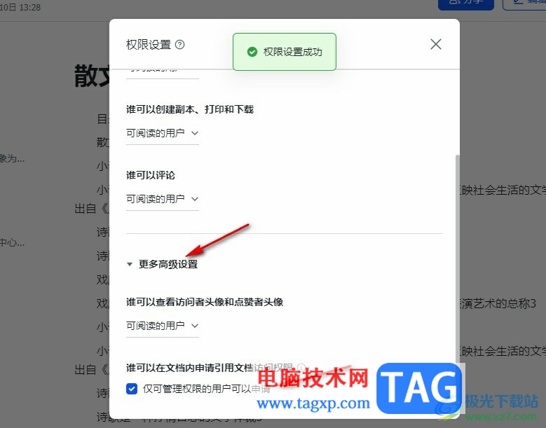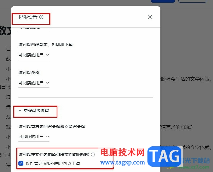 以上就是小编整理总结出的关于飞书设置申请引用文档访问权限的方法,我们在飞书的文档编辑页面中打开权限设置选项,然后在弹框中先打开“更多高级设置”选项,再勾选“仅可管理权限的用户可以申请”选项即可,感兴趣的小伙伴快去试试吧。