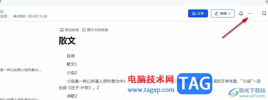 3、第三步,进入文档页面之后,我们在页面上方的工具栏中点击打开“...”图标