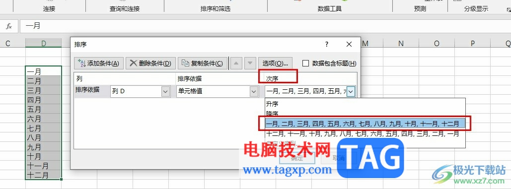 5、第五步,点击确定选项之后回到排序弹框之后再点击一次确定选项,然后就能得到自动排好序的月份了