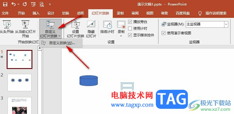 3、第三步,在幻灯片放映的子工具栏中,我们点击打开“自定义幻灯片放映”选项
