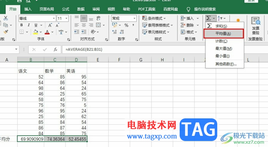 以上就是小编整理总结出的关于Excel表格自动计算各科平均分的方法,我们在Excel中点击一个空白单元格,然后在开始的子工具栏中打开计算工具,再在下拉列表中选择“平均值”选项,最后设置好数据区域并点击回车键即可,感兴趣的小伙伴快去试试吧。