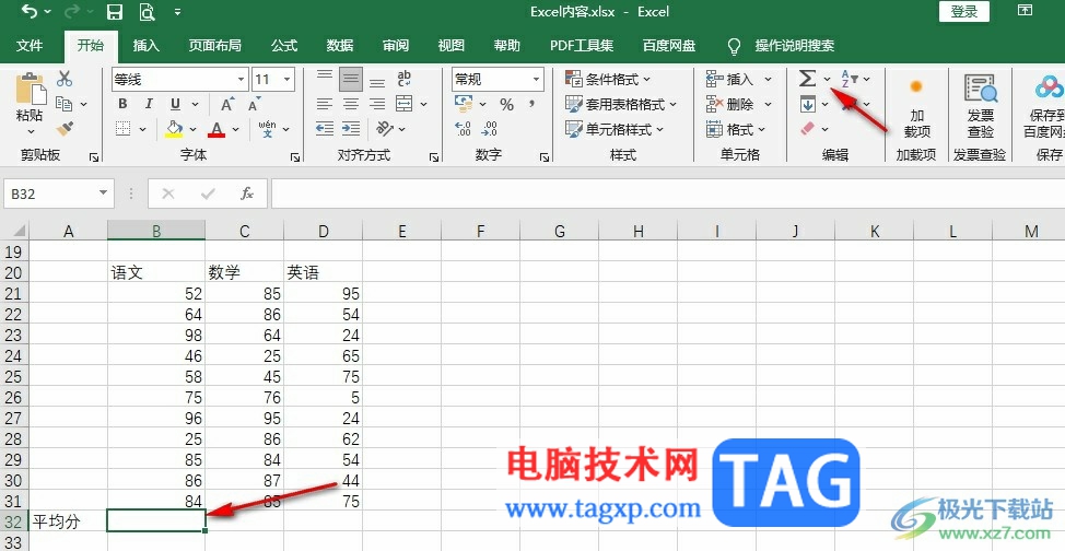 很多小伙伴在对表格文档进行编辑时都会选择使用excel程序,因为Excel中的功能十分的丰富,并且操作简单,能够提高表格文档的编辑效率,在使用Excel程序对表格文档进行编辑的过程中,有的小伙伴可能会遇到需要对各科分数进行平均分计算的情况,为了减少工作量,我们可以先点击结果所在单元格,然后在开始的子工具栏中打开计算工具,接着在下拉列表中选择平均值工具,最后设置好数据区域并点击回车键即可。有的小伙伴可能不清楚具体的操作方法,接下来小编就来和大家分享一下Excel表格自动计算各科平均分的方法。