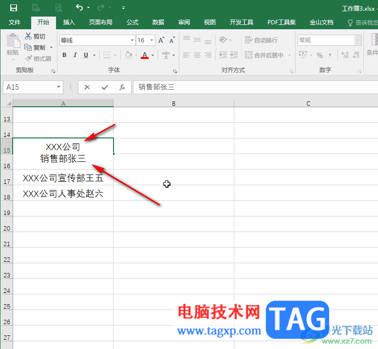 第三步:按键盘上的alt+enter键,就可以看到成功在同一个格子里面换行了,后续可以继续输入内容,也可以点击其他任意单元格退出编辑状态,或者按enter键进行确认退出;