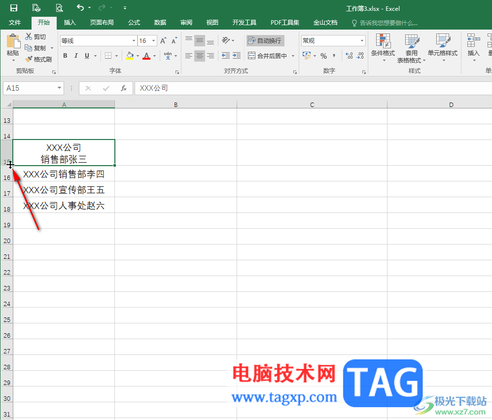 第四步:后续还可以将鼠标悬停到行号与行号之间的边界线上,变成如图所示的双向箭头时上下拖动,适当调整行高;
