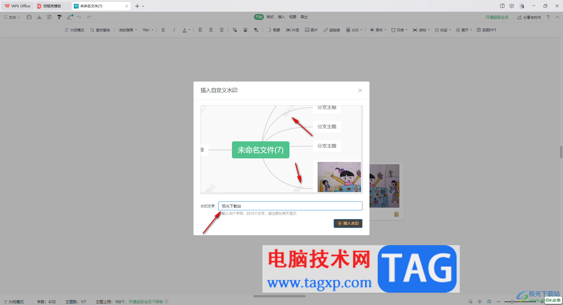 在wps中进行思维导图的创建是非常不错的,大家可以通过在WPS中将一些资料以及工作事务整理成思维导图的样式展示出来,这样方便自己查看和巩固这些重要的内容,而在创建好思维导图之后,如果你想要更好的保证该思维导图的原创性,那么你可以在该创建页面中进行水印的添加设置,直接在创建好的导图页面中进行设置水印的内容就好了,操作起来十分的简单且方便,下方是关于如何使用WPS思维导图添加水印的具体操作方法,如果你需要的情况下可以看看方法教程,希望对大家有所帮助。