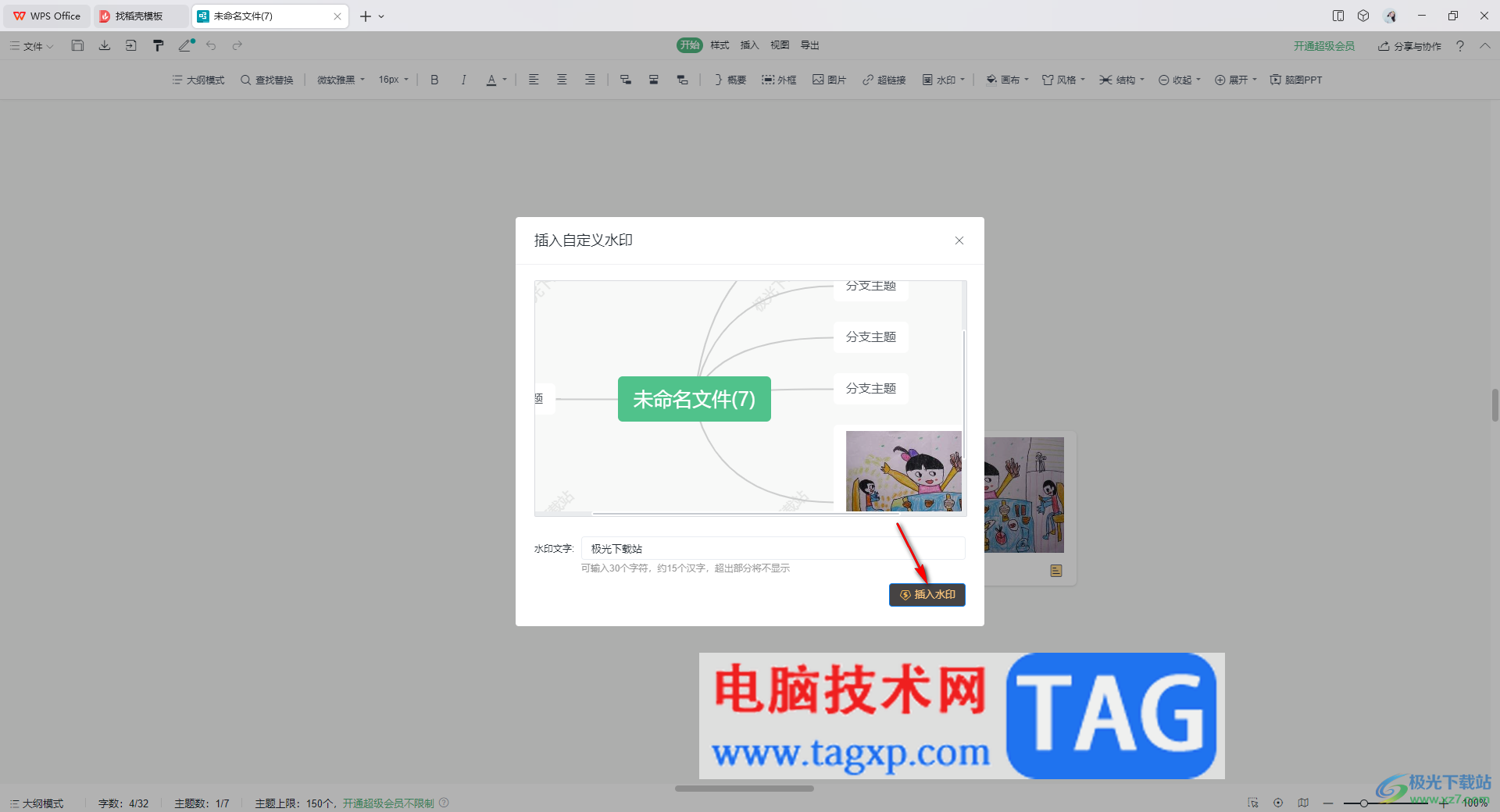 5.最后就可以直接点击【插入水印】按钮添加水印即可,添加好之后,可以将思维导图导出为图片、PDF等文件格式保存。