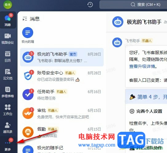 1、第一步,我们先打开电脑中的飞书软件,然后在软件页面左侧的列表中打开“更多”选项