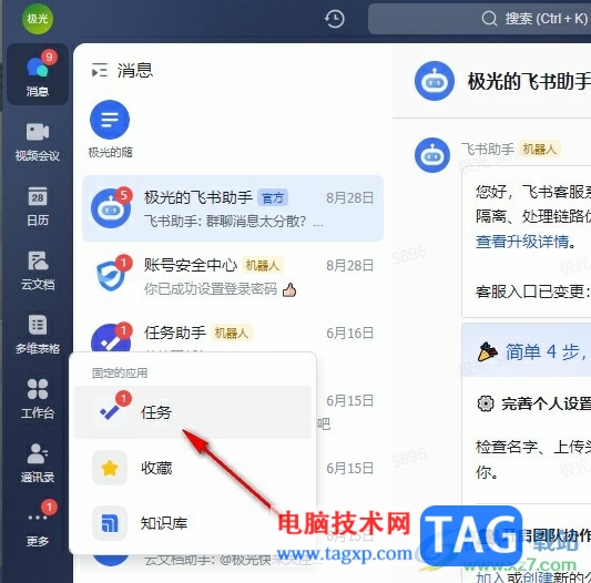 2、第二步,打开更多选项之后,我们在菜单列表中点击打开“任务”选项