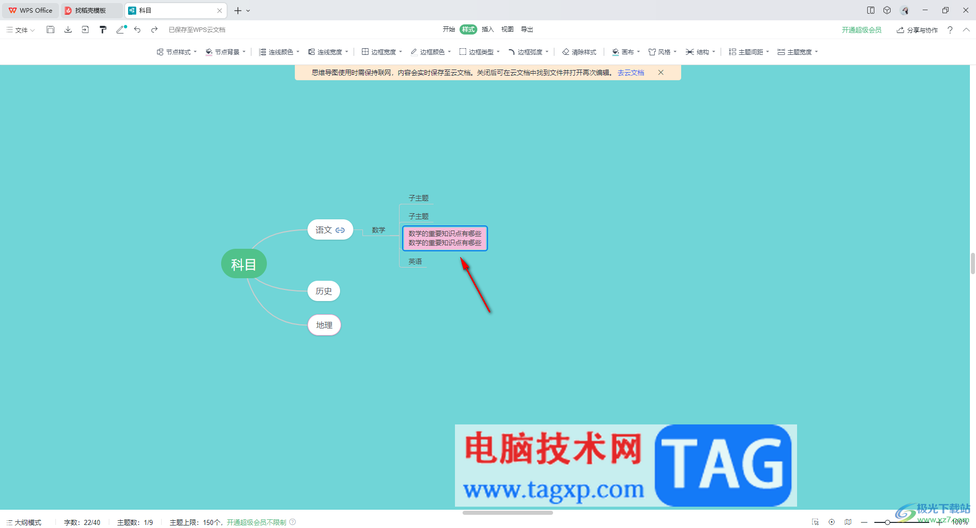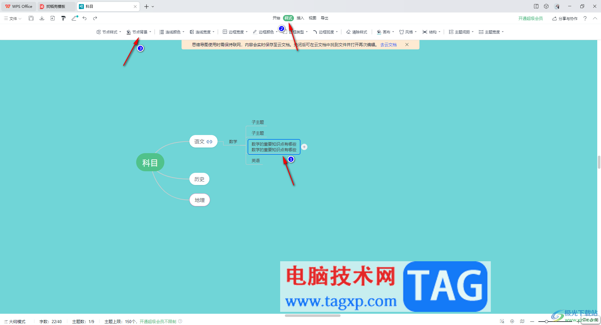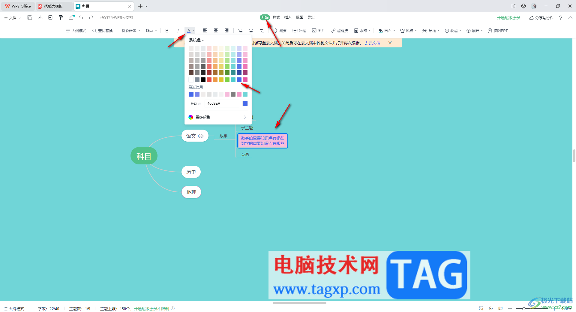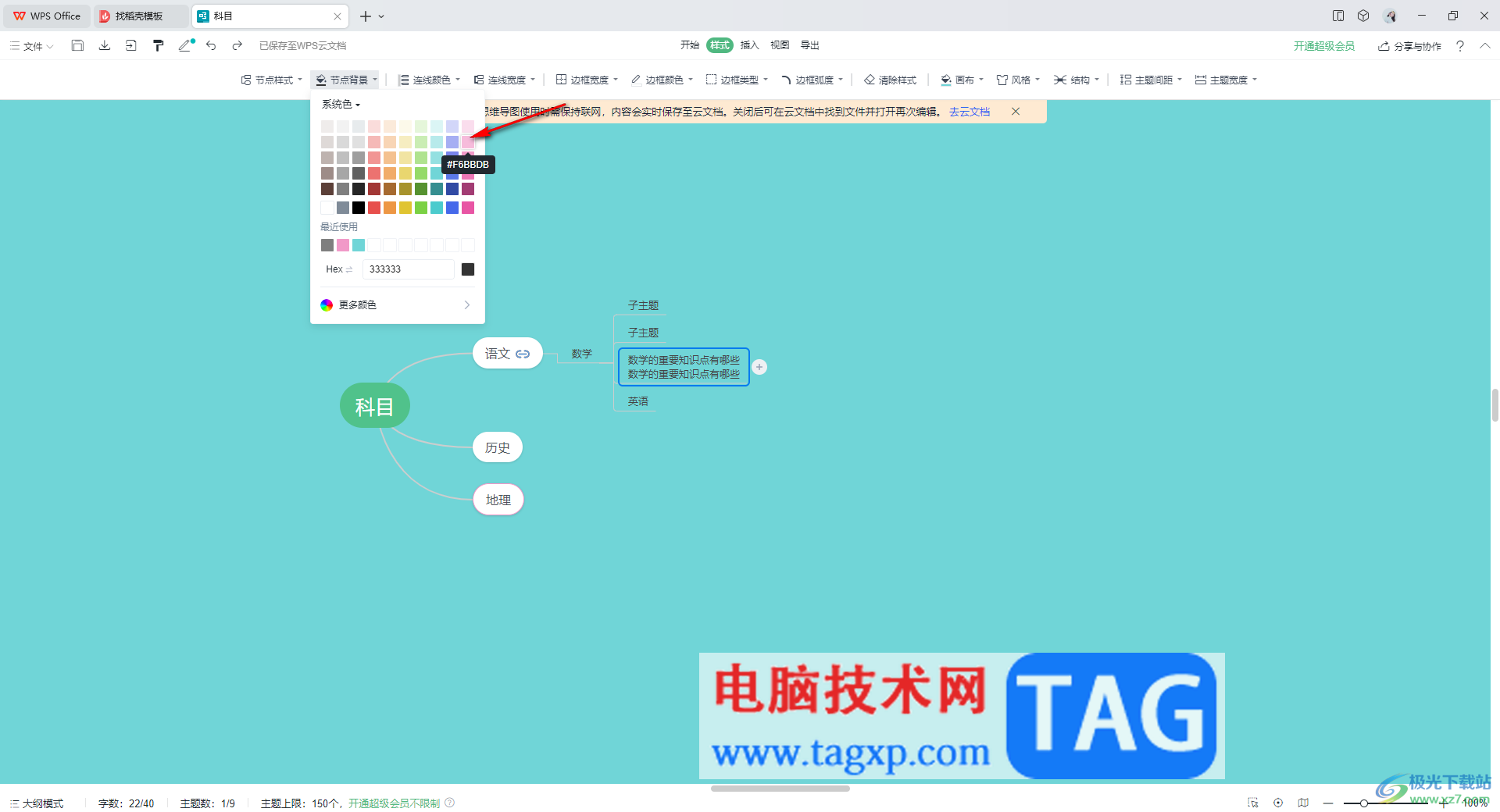 以上就是关于如何使用WPS思维导图设置高亮文字的具体操作方法,当你需要将一些重要的文字突出显示时,那么可以将主题框的背景和字体颜色进行设置一下就好了,操作起来十分的简单,且一点的不复杂,感兴趣的话可以操作试试。