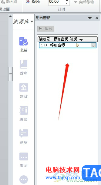 3.这时页面的右侧会弹出动画窗格,用户因此点击幻灯片来找到插入音频文件的幻灯片,找到后用户点击音频文件