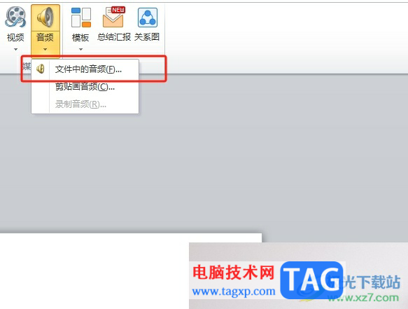 3.接着将会弹出下拉选项卡,用户选择其中的文件中的音频选项