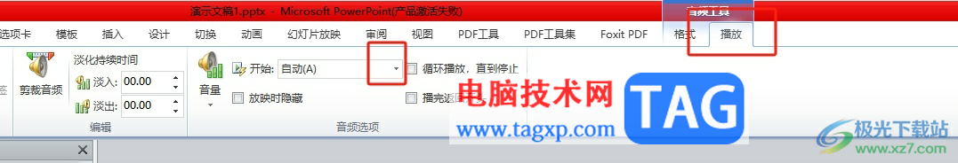 6.随后可以看到菜单栏中出现的音频工具,用户选择播放图标,在弹出来的选项卡中,需要在音频选项板块中点击开始选项的下拉箭头
