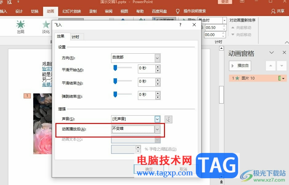 5、第五步,进入效果选项页面之后,我们将“动画播放后”的选项设置为“不变暗”,最后点击确定选项即可