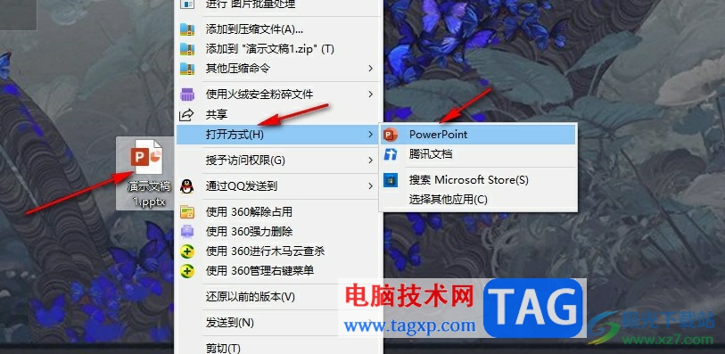 1、第一步,我们在电脑中右键单击一个演示文稿,然后先点击“打开方式”选项,再在子菜单列表中选择“powerpoint”选项