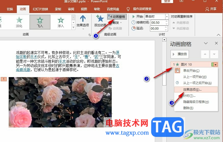 4、第四步,接着我们打开“动画窗格”,再在窗格页面中右键单击视频的动画效果,然后在菜单列表中选择“效果选项”
