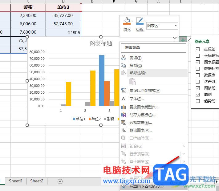 2、第二步,进入Excel页面之后,我们右键单击图表,然后在菜单列表中选择“设置图表区域格式”选项