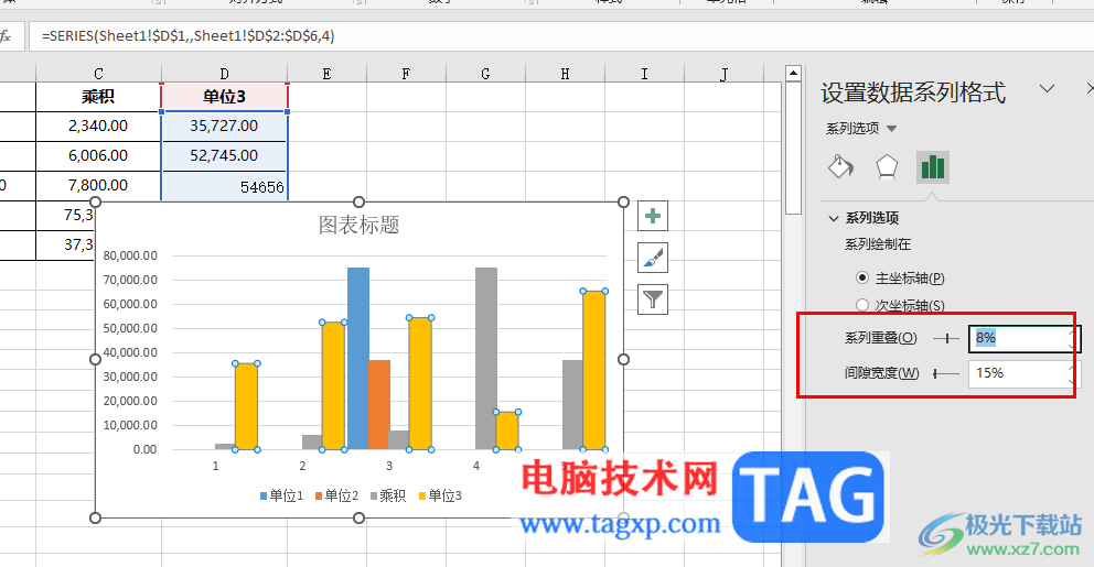 以上就是小编整理总结出的关于Excel图表当中的柱状图加粗的方法,我们在Excel中右键单击图表,然后选择设置图表区域格式选项,接着在右侧窗格中,我们先打开系列选项,然后在该选项页面中调整系列重叠和间隙宽度的数值即可,感兴趣的小伙伴快去试试吧。