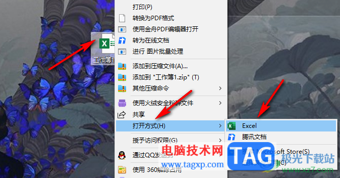 1、第一步,我们右键单击一个表格文档,然后在菜单列表中点击“打开方式”选项,接着选择“Excel”选项