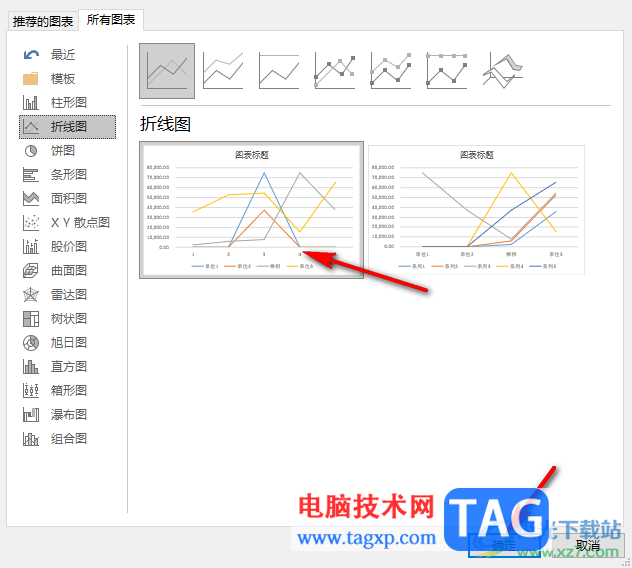 4、第四步,在折线图页面中,我们找到并选择自己需要的折线图样式,然后点击确定选项即可