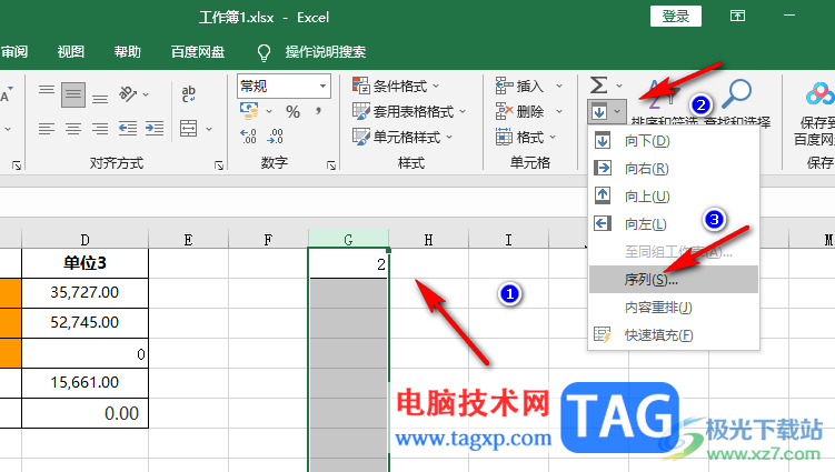 3、第三步,选中“2”所在的一列,接着在填充工具的下拉列表中选择“序列”选项