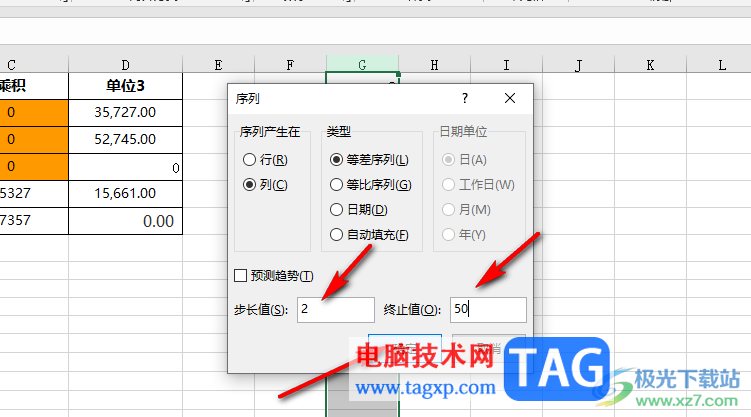 4、第四步,进入序列弹框中,我们在步长值处输入“2”,然后在终止值处输入“50”,最后点击“确定”选项即可