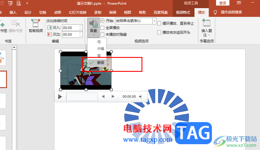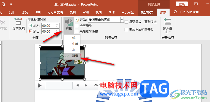 以上就是小编整理总结出的关于PPT设置插入的视频静音的方法,我们在PPT中先插入一个视频,然后在工具栏中打开播放工具,接着在其子工具栏中打开音量选项,再在下拉列表中选择静音选项即可,感兴趣的小伙伴快去试试吧。